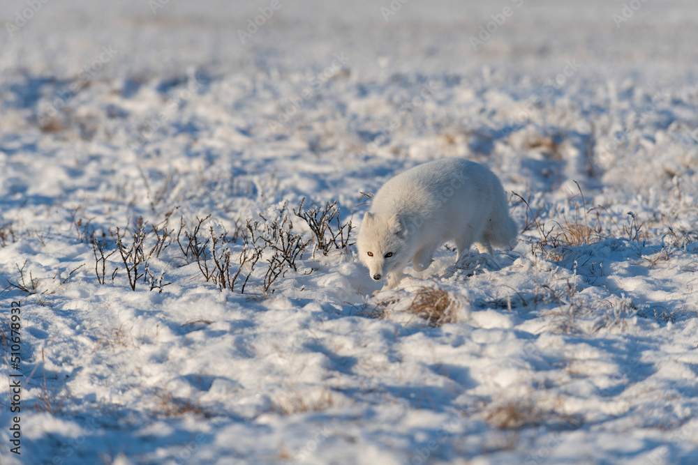 Wild arctic fox (Vulpes Lagopus) in tundra in winter time. White arctic fox.