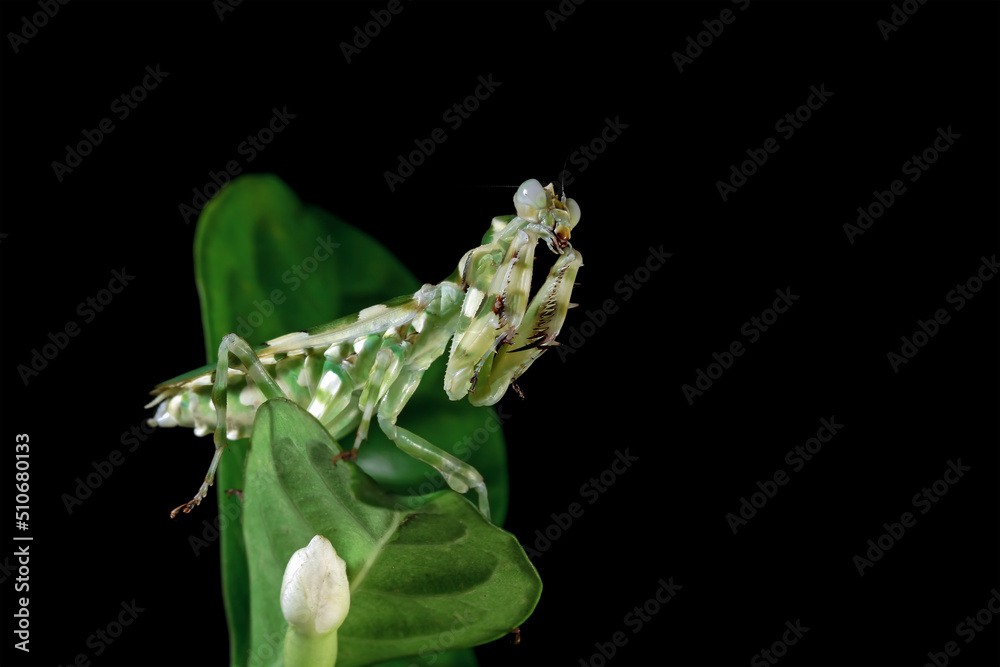 Banded flower mantis on a leaves with black background, ribbon flower grasshopper