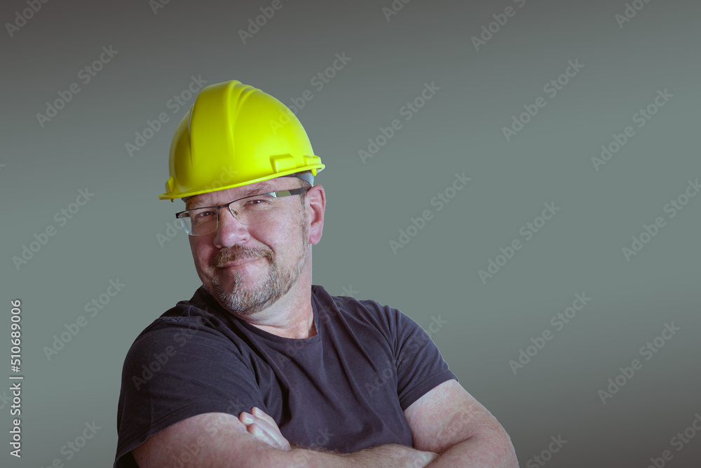 confident smiling man in a yellow protectiv helmet, glasses copy space