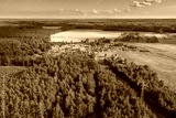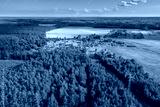 Rozległy, płaski teren pokryty zielonymi polami uprawnymi i łąkami. Widać polną drogę, kępy drzew, oraz na obrzeżach iglasty las. Widok