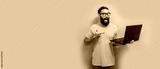 Young crazy bearded charismatic man. Shocked or surprised expression. Laptop concept. Funny promotion poster. Programmer, web developer holding a laptop in his hands and looking at the camera