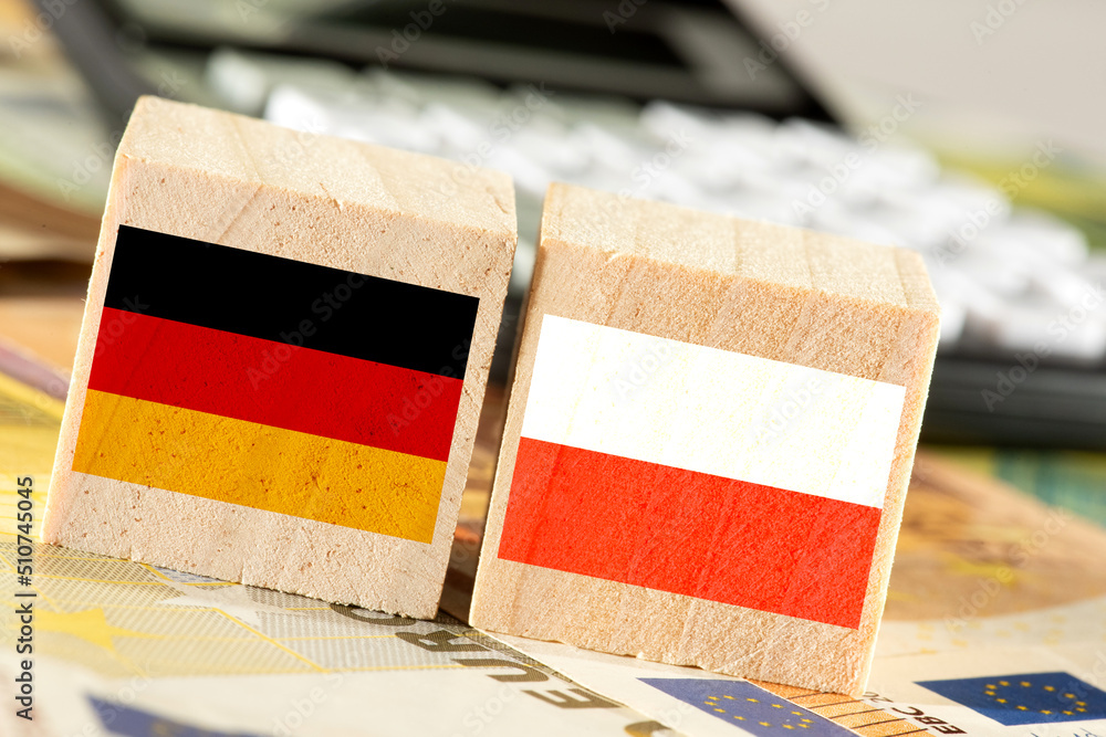 Flaggen von Deutschland und Polen, Euro Geld und ein Taschenrechner