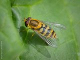 A hoverfly sitting on a green leaf