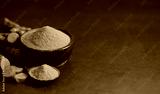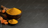 Turmeric powder and fresh turmeric (curcumin) on a black background, spices, copy space