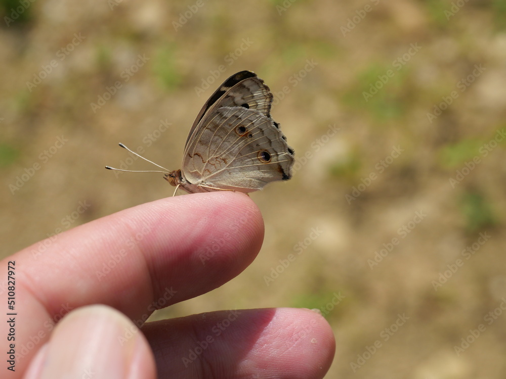 Blue Pansy Butterfly on human finger and hand with natural brown background, The pattern resembles orange eyes on the black and brown wing