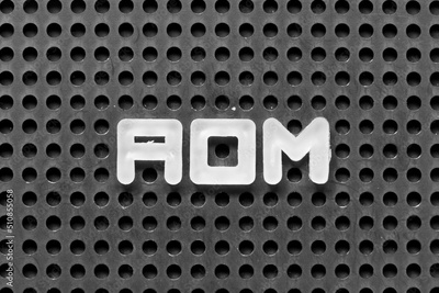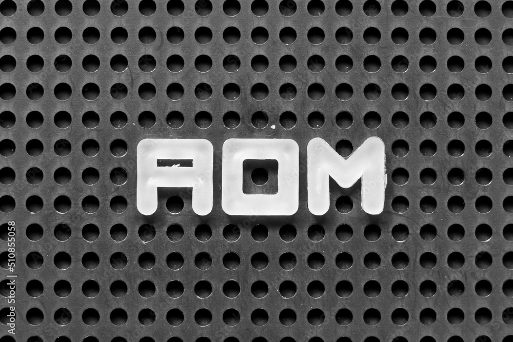 White alphabet letter in word AOM (Abbreviation of Advanced order management, add on module or assistant operation manager) on black pegboard background