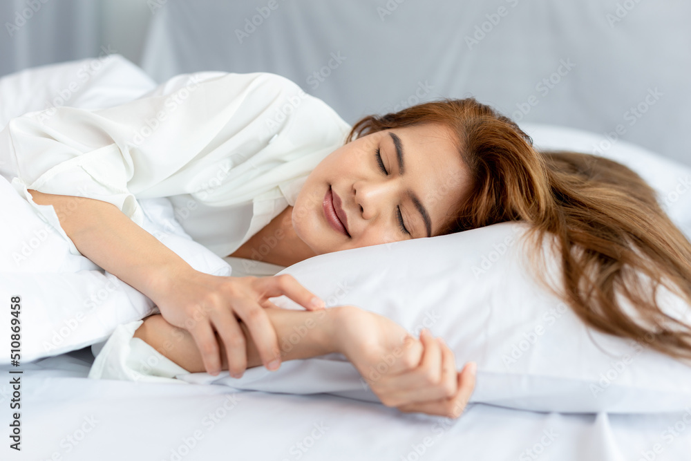 Portrait of a beautiful blonde woman lying happily in bed at home.