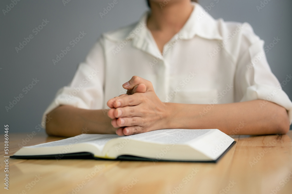 Close up of hands folded in prayer on a Holy Bible isolated on grey studio background, pray for god blessing wishing better life. Faith, belief concept.