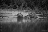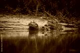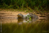Wild caiman with fish in mouth in the nature habitat. Wild brasil, brasilian wildlife, pantanal, green jungle, south american nature and wild, dangereous.