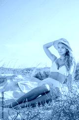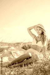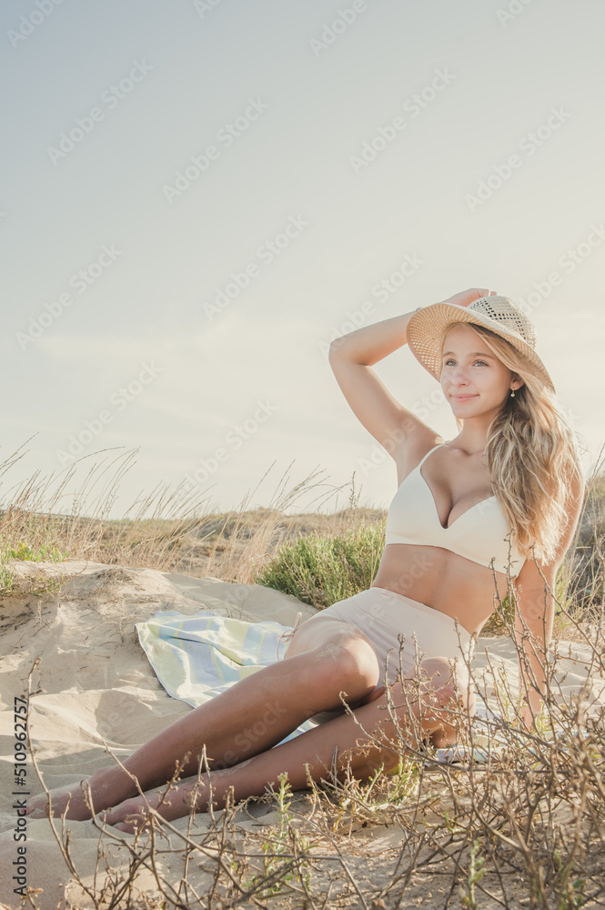 Young blonde candid smiley woman in bikini and hat enjoys a day at the beach sitting elegantly on the sand on the mediterranean coast. Summer warm colors.