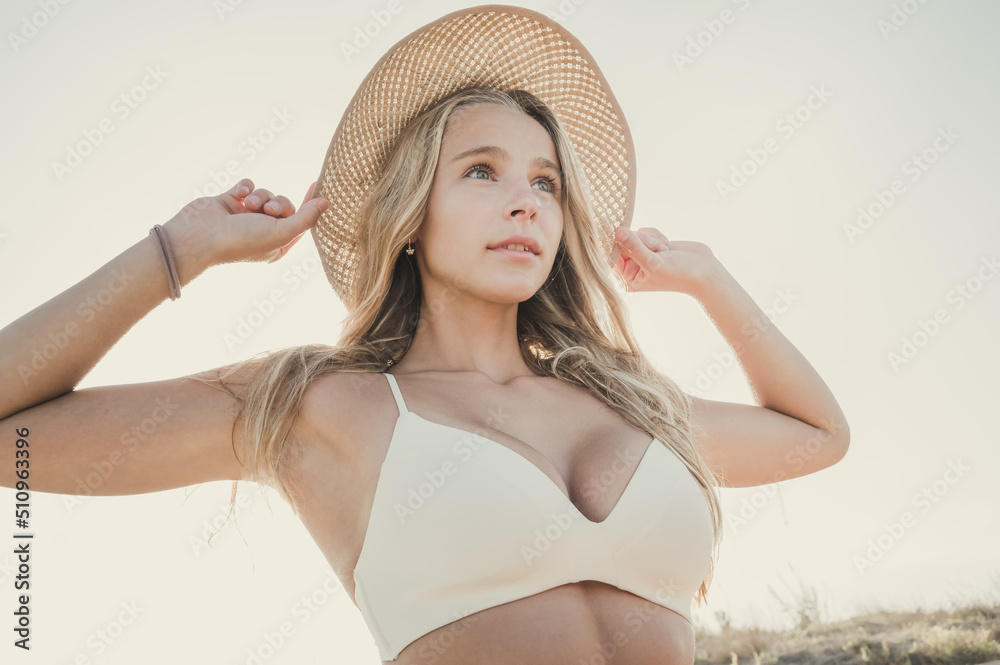 Young blonde woman in bikini holding a hat enjoys a day at the beach on the mediterranean coast. Summer warm colors.