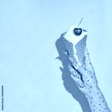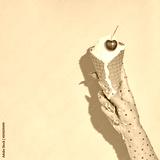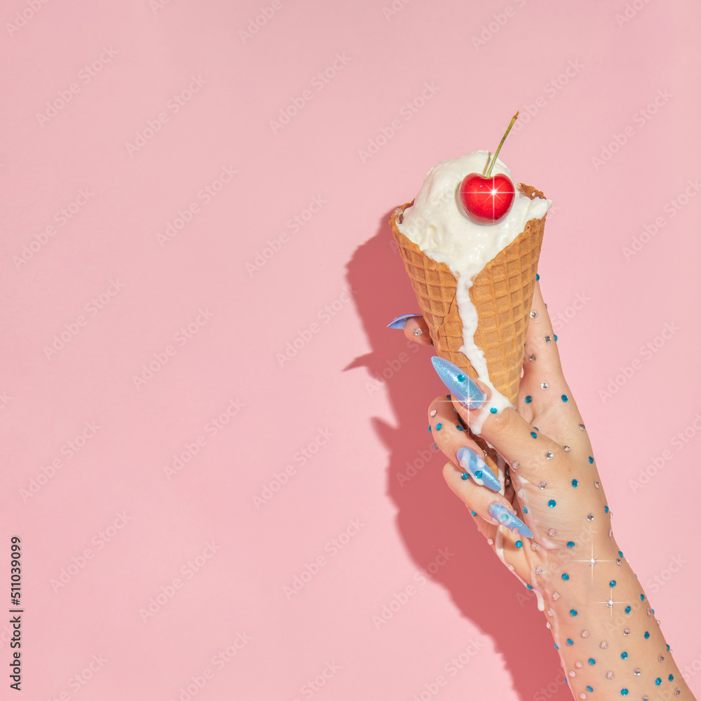 Summer creative layout with woman hand with sparkle stones holding melting ice cream cone with cherry on pastel pink background. 70s, 80s or 90s retro aesthetic fashion idea.