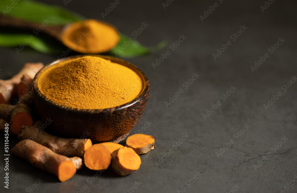 Turmeric powder and fresh turmeric (curcumin) on a black background, spices, copy space
