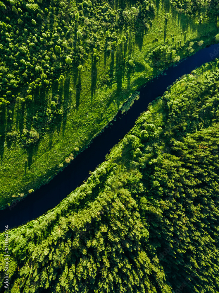 Aerial view of green woods with blue curved river. Beautiful summer landscape