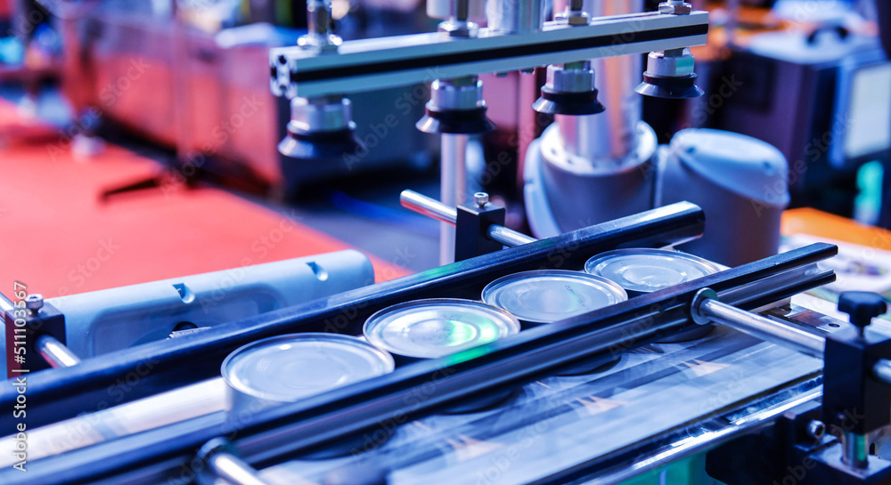 Canned food products on conveyor belt in distribution warehouse. parcels transportation system concept