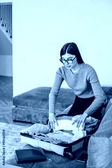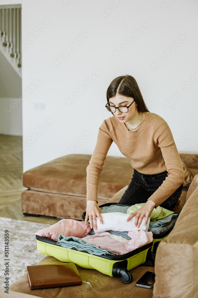 Happy young woman packing travel suitcase at home. Vacation preparation. Tourist trip.