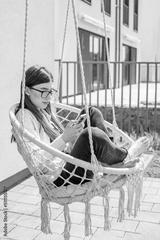 Young adult girl sits in hanging wicker swing and uses mobile device, browses social networks