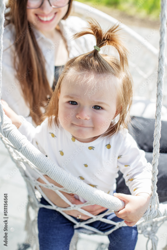 Happy mom and little baby girl are swinging on swing chair in backyard of house.
