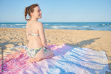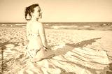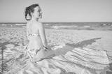 Young adult woman enjoys last hours of the day at a Mediterranean calm beach. She has a ponytail and is wearing a bikini and lies on a towel in front of the Mediterranean Sea.