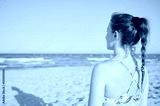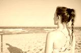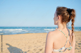 Close up of a young adult woman while enjoys last hours of the day at a Mediterranean calm beach. She has a ponytail and is wearing a bikini and lies on a towel in front of the Mediterranean Sea.