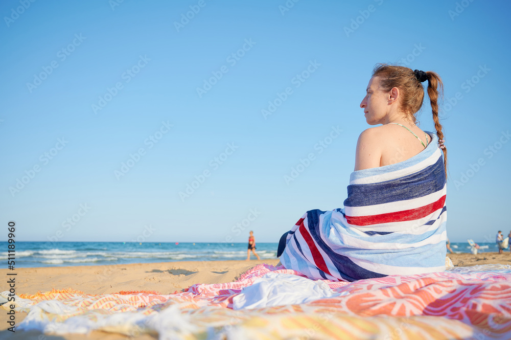 Young adult woman enjoys last hours of the day at a Mediterranean calm beach. She has a ponytail and is wrapped on a towel and lies on a pareo in front of the Mediterranean Sea.
