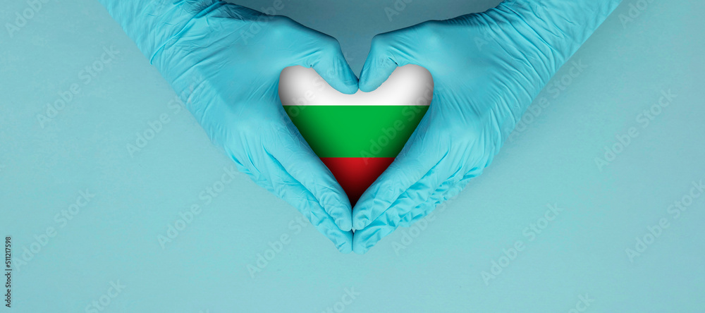 Doctors hands wearing blue surgical gloves making hear shape symbol with bulgaria flag