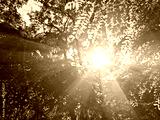 Upward glance to sun rays shines through forest trees. Scattered sunlight that filters through green leaves. Sunny summer nature background with sunshine radiant bokeh. Japanese Komorebi concept