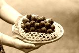 Gardener hand holding pulp of tasty organic bunch of black grapes on blur background, Fresh Kyoho Grape on natural farm background