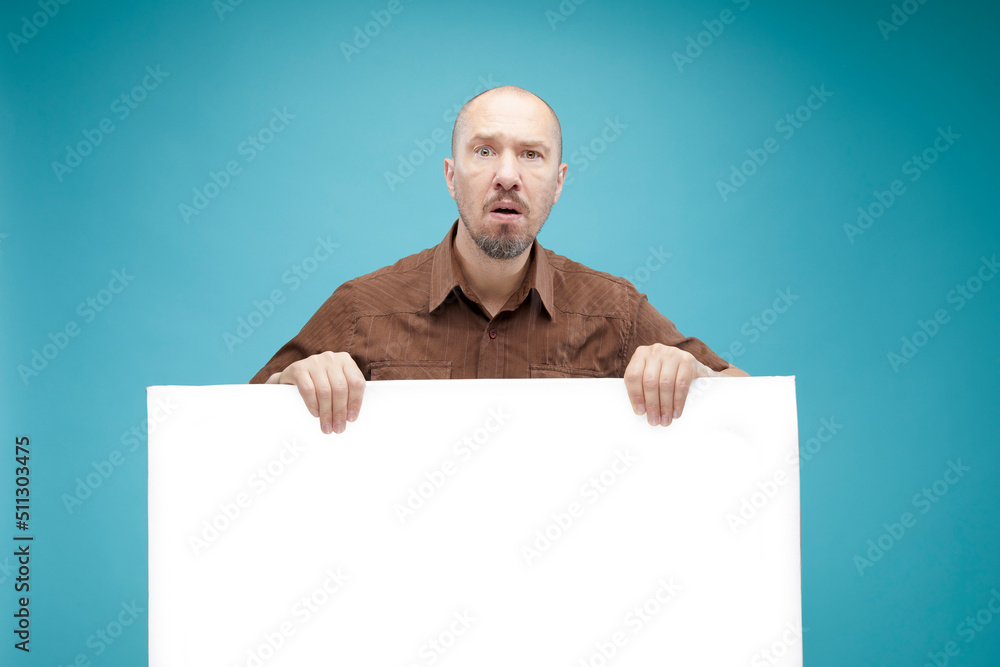 A Bald man with emotion face holding white board in his hands to fill your text. Isolated on blue background.