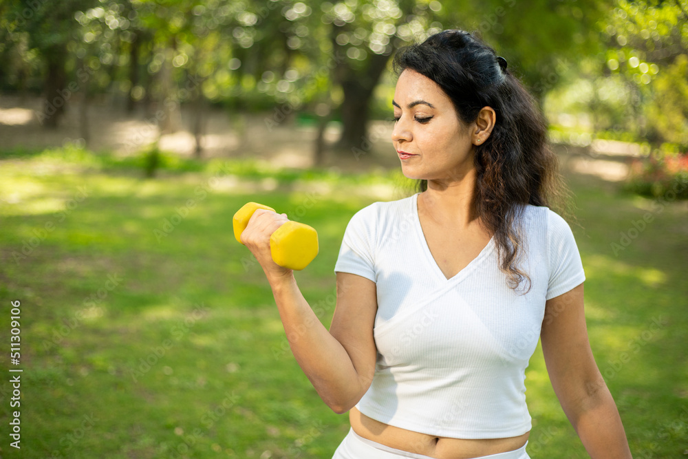 Closeup of young Indian woman doing dumbbell workout at park, working on arms strength, Asian athletic lady exercising outdoor in nature, fitness concept.