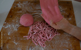 hands of woman preparing red beet tagliatelle