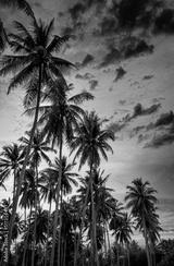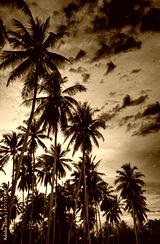 Silhouette coconut palm trees on beach at sunset. Vintage tone.