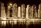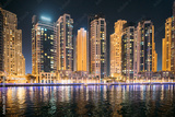 Night view of high-rise buildings of residential district in Dubai Marina. Dubai Marina Towers. Dubai Marina Skyline Background. Holidays In United Arab Emirates. Vacation In UAE. Night view of high