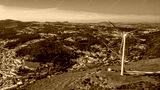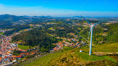 Wind turbine on the background of a small European city, a close-up view. The concept of clean Renewable energy.