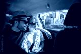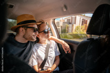 Young cheerful happy couple of travelers sitting in the car in the back seat looking out the window
