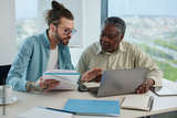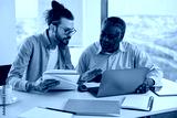 An educator patiently explaining to an african senior student how to solve a programming problem.