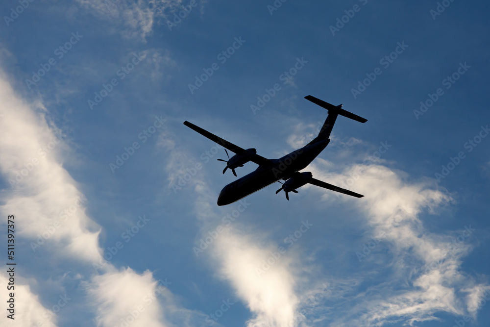 A large modern plane flies in the sky, a view from below from the ground to the belly of the aircraft.