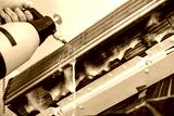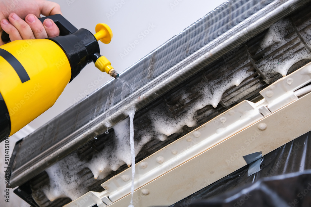 A man washes off a special foam for cleaning air conditioners with a jet of water under pressure. Split system maintenance.