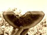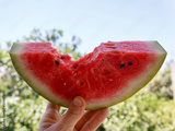Close-up of big ripe bitten watermelon slice in hand