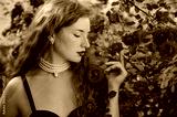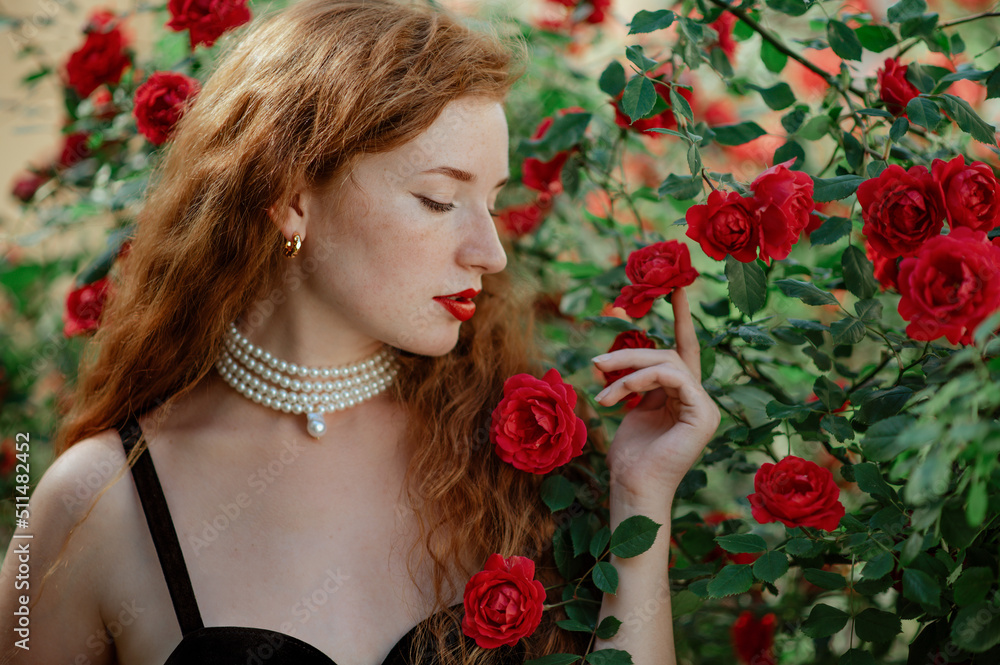 Beautiful redhead freckled woman wearing elegant pearl necklace, golden earrings, posing in red rose garden. Copy, empty space for text