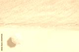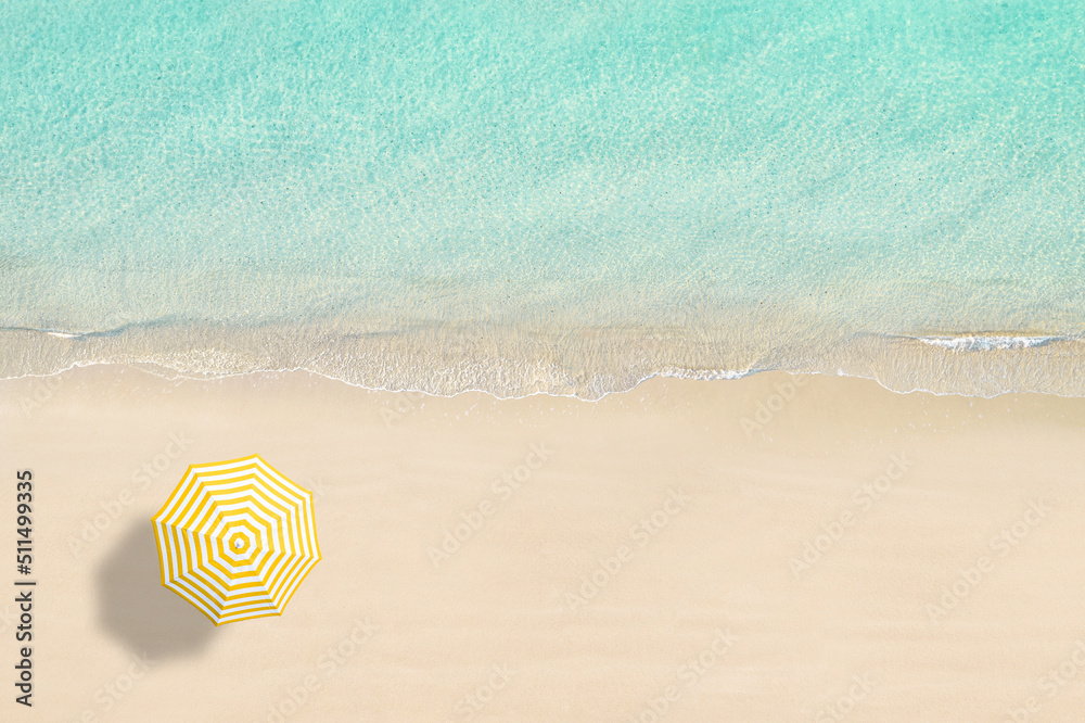 Aerial view of yellow umbrella on sandy beach. Summer and travel concept. Blue, turquoise transparent water surface of ocean, sea, lagoon. Aerial, drone view