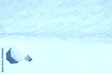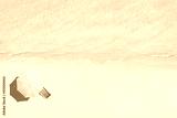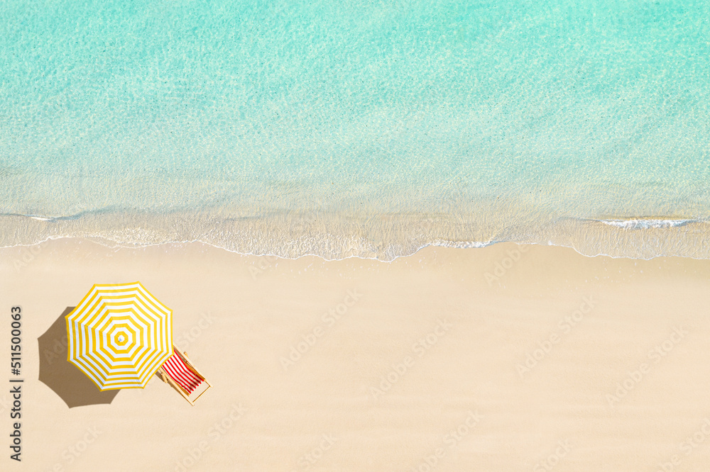 Aerial view of wooden sunbed, lounge, yellow umbrella on sandy beach. Summer and travel concept. Blue, turquoise transparent water surface of ocean, sea, lagoon. Aerial, drone view