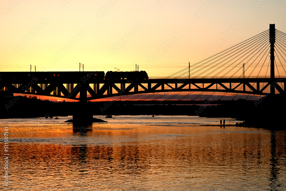 Traffic on the railway bridge. Train at sunset.