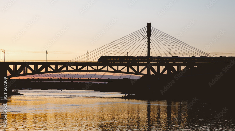 Traffic on the railway bridge. Train at sunset.