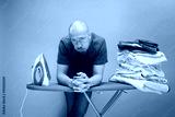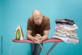 A funny bald man with emotions using electrical iron on ironing board over on blue background.