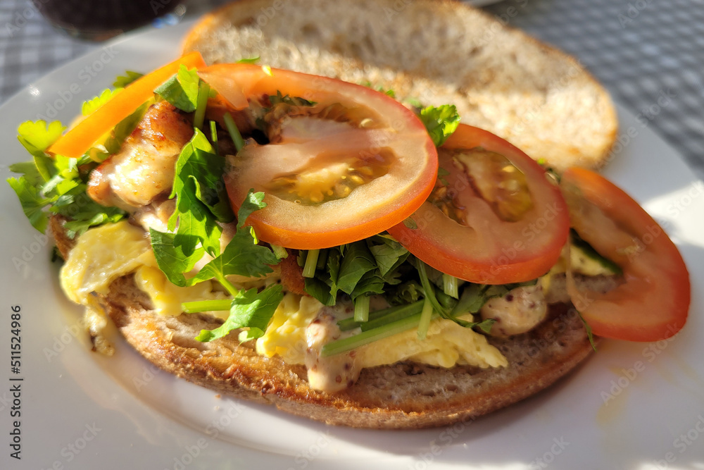 Toasted sandwich bread with fried egg, parsley and tomato. Homemade breakfast close up.