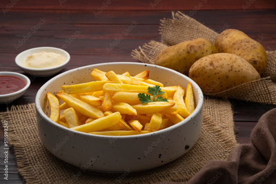 Air Fryer Roast Potatoes on white plate with ketchup and mayo dip