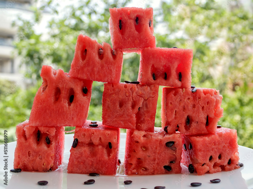 Close-up of watermelon tower made of ripe pink juicy cubical pieces