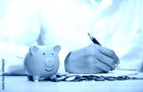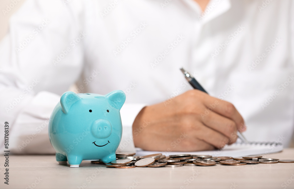 blue piggy bank and coins on a wooden table, male businessman doing accounting, business, investment, finance, and money savings for future concepts.