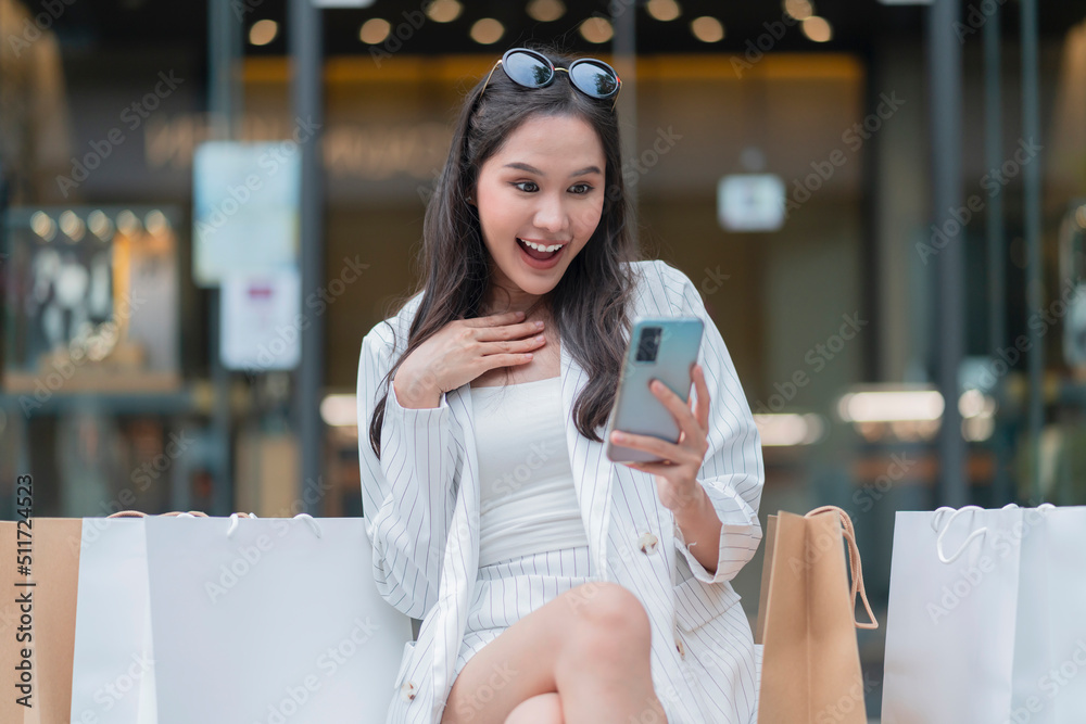 Exited joyful asia woman big surprise cloth discount sms show on smartphone ,asian woman using smartphone checking new promotion sale summer event at mall department store while relax on wooden bench